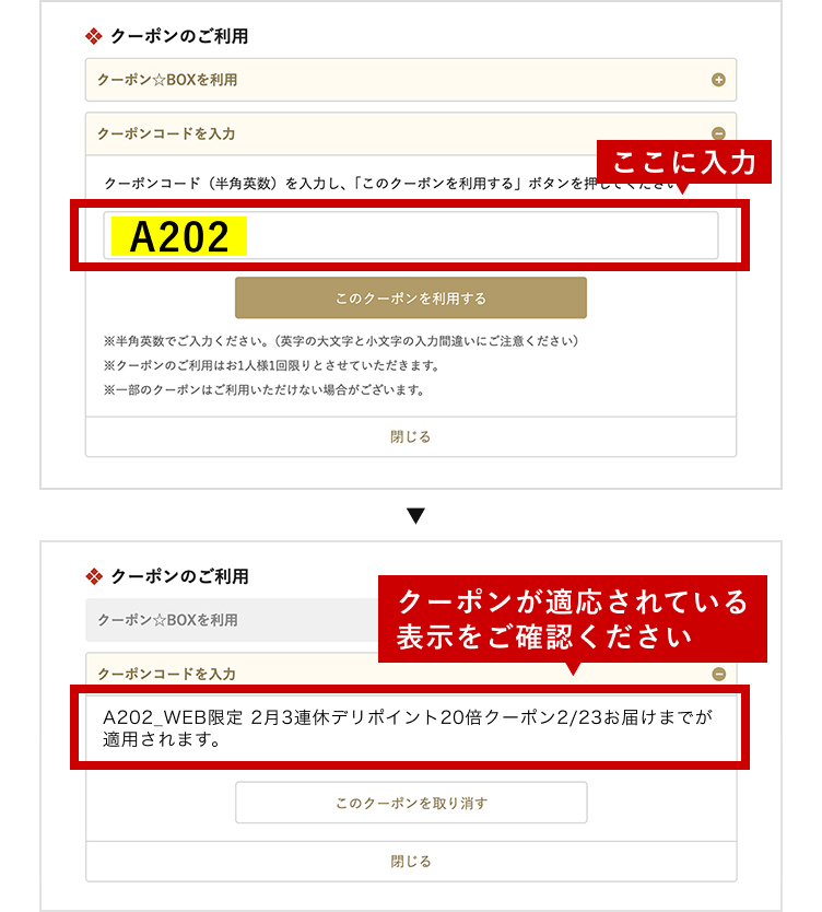 「クーポンコードを入力」を選択し、クーポンコード A202を入力し、最後に「このクーポンを利用する」を押してください。