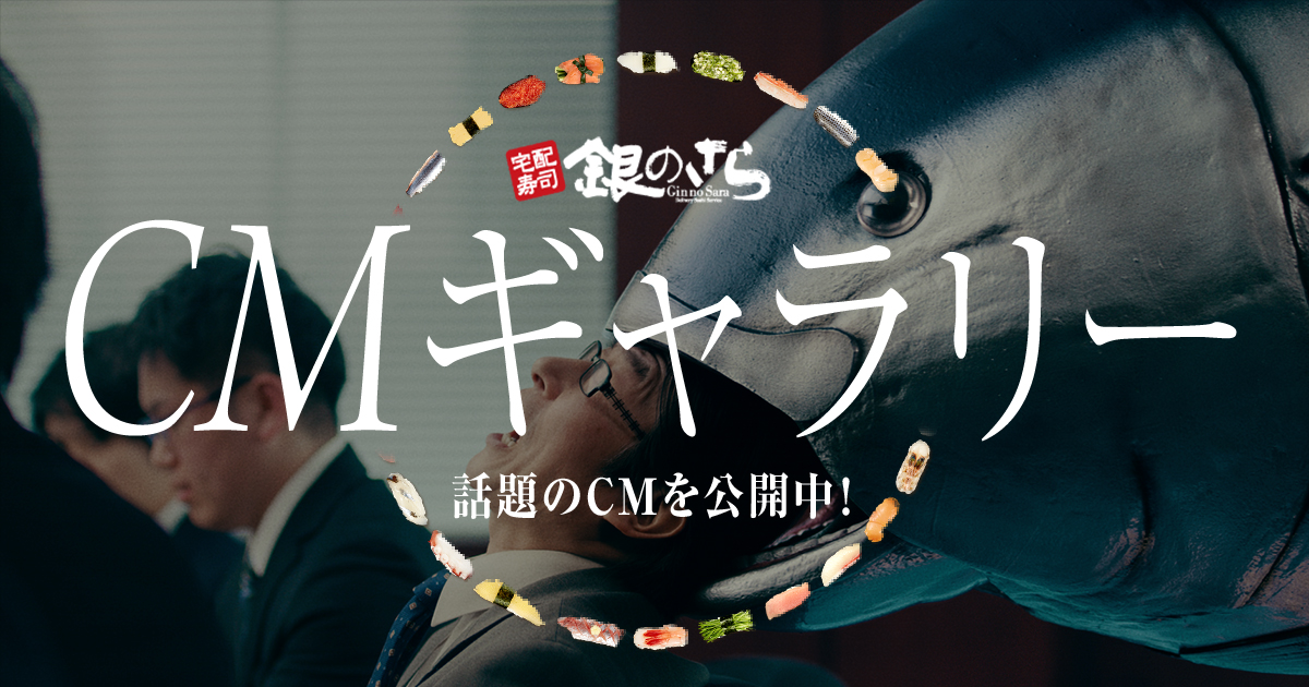 宅配寿司 銀のさら 「CMギャラリー」 話題のTV CMを公開中!CM撮影時のエピソードなどもご紹介します。 twitter facebook