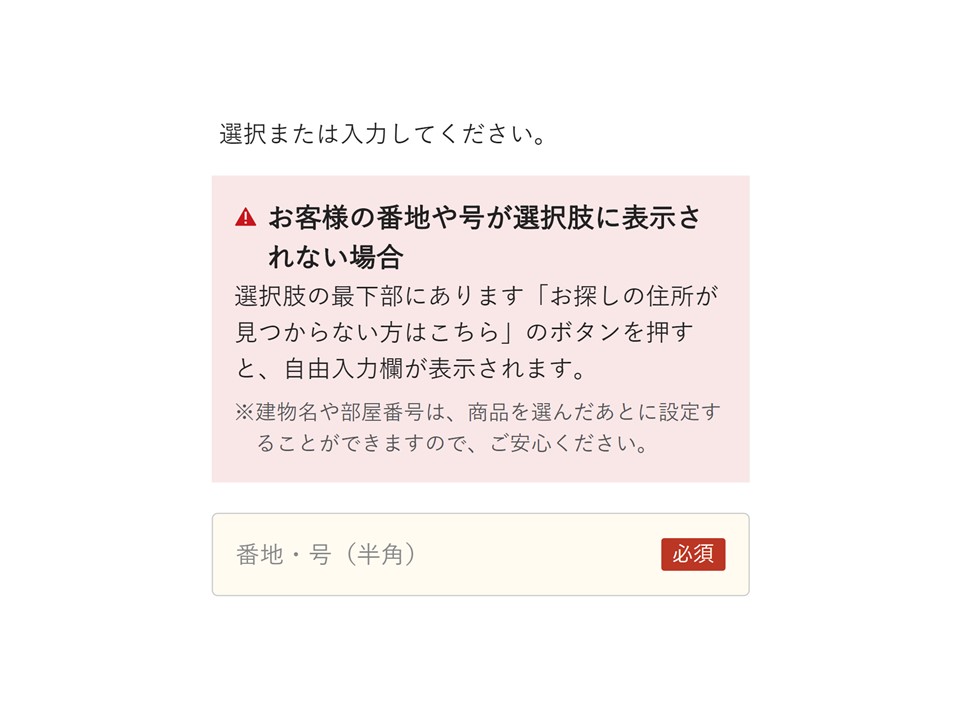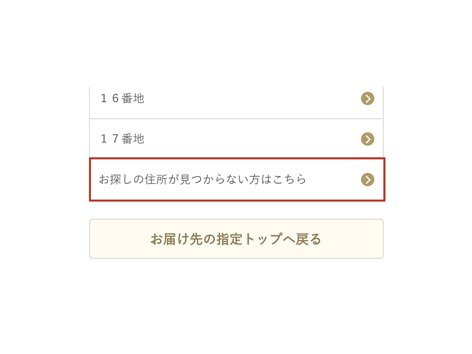 番地や号に該当の選択肢が表示されない場合は、選択肢の最下部にある「お探しの住所が見つからない方はこちら」を選択してください。