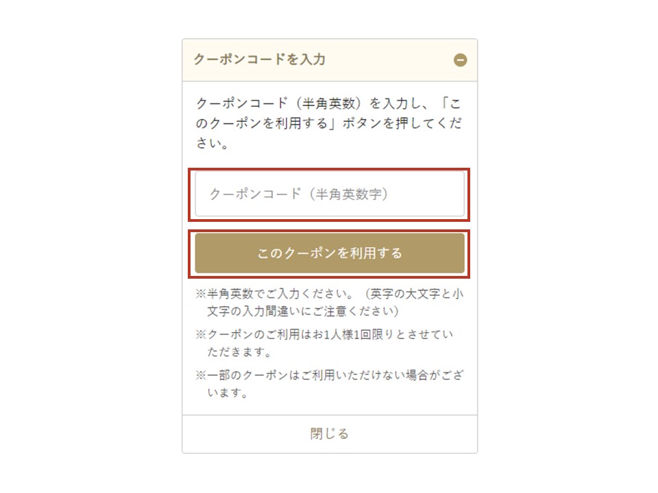 (2)ご利用になりたいクーポンコード(半角英数字)を入力し、「このクーポンを利用する」ボタンを押してください。