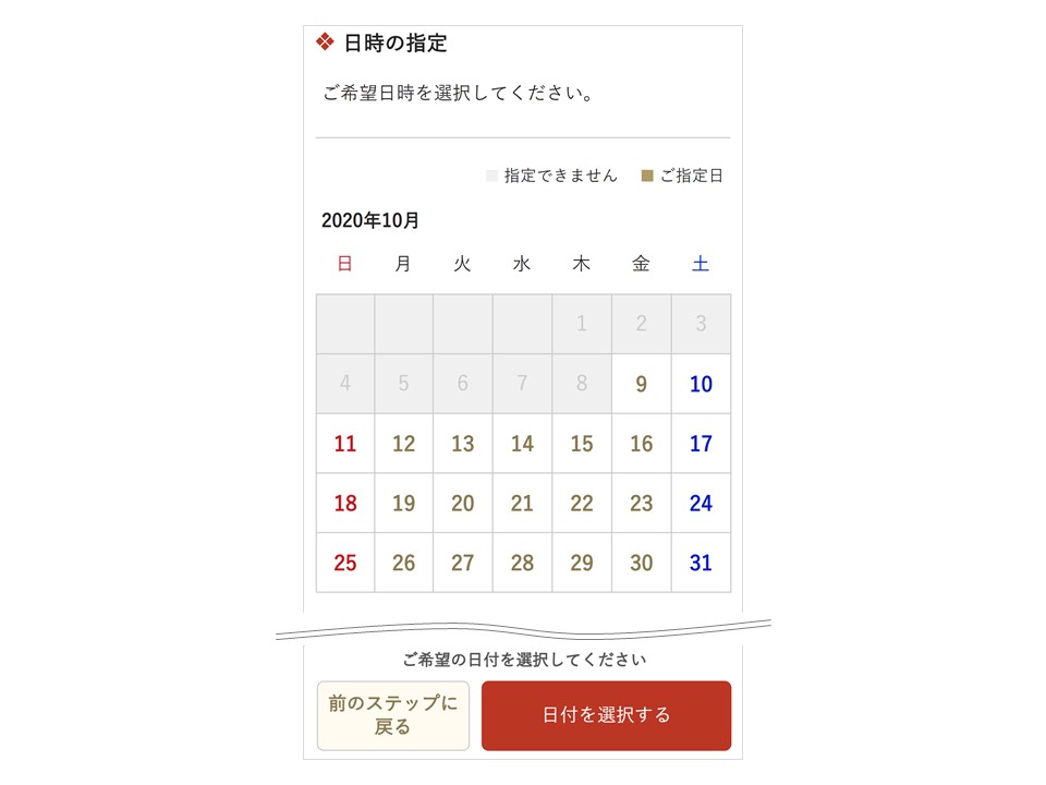 ご指定の日時が表示されますので、問題ないようでしたら「指定の日時で次へ」ボタンで商品の選択画面に進みます。