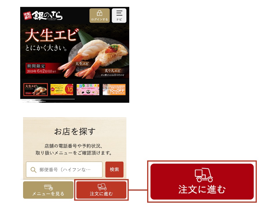 トップページの「注文に進む」ボタンを押して、注文を開始します。