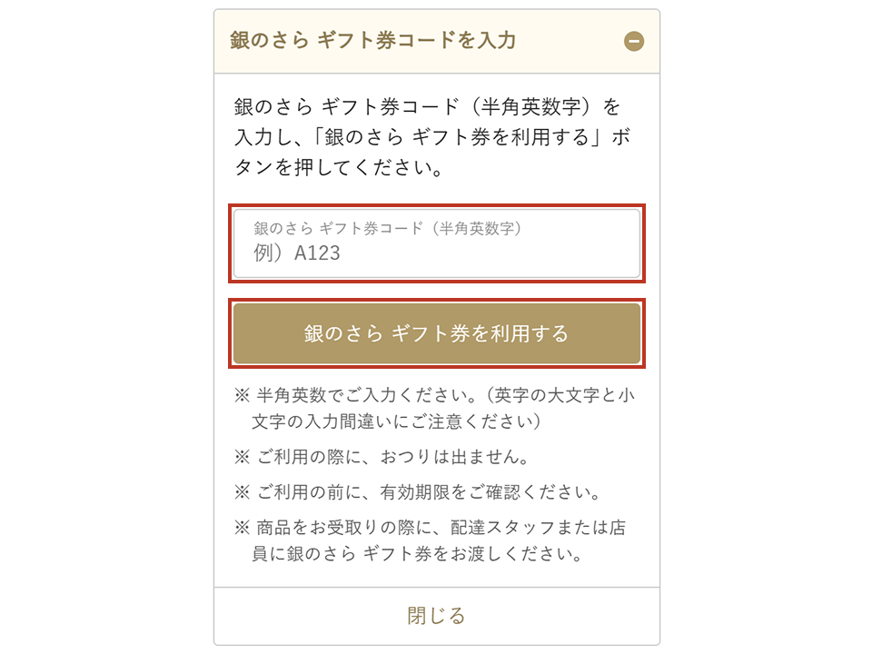 (1)銀のさらギフト券コード(半角英数字)を入力し、「銀のさらギフト券を利用する」ボタンを押してください。