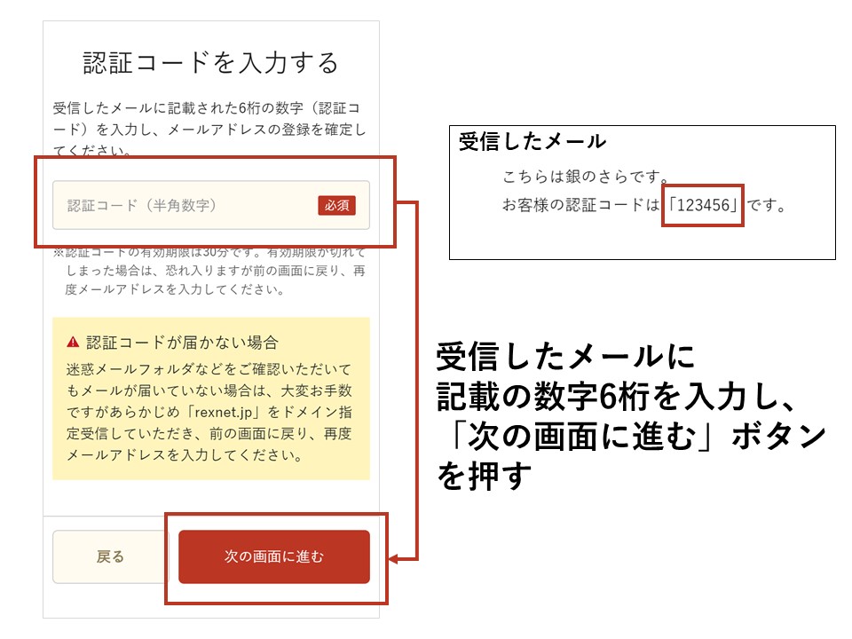 メールに記載されている6桁の数字(認証コード)を入力し、「次の画面に進む」ボタンを押してください。