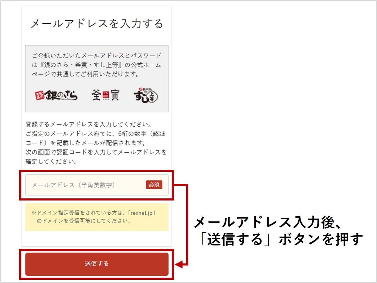 メールアドレスを入力し、「送信する」ボタンを押してください。