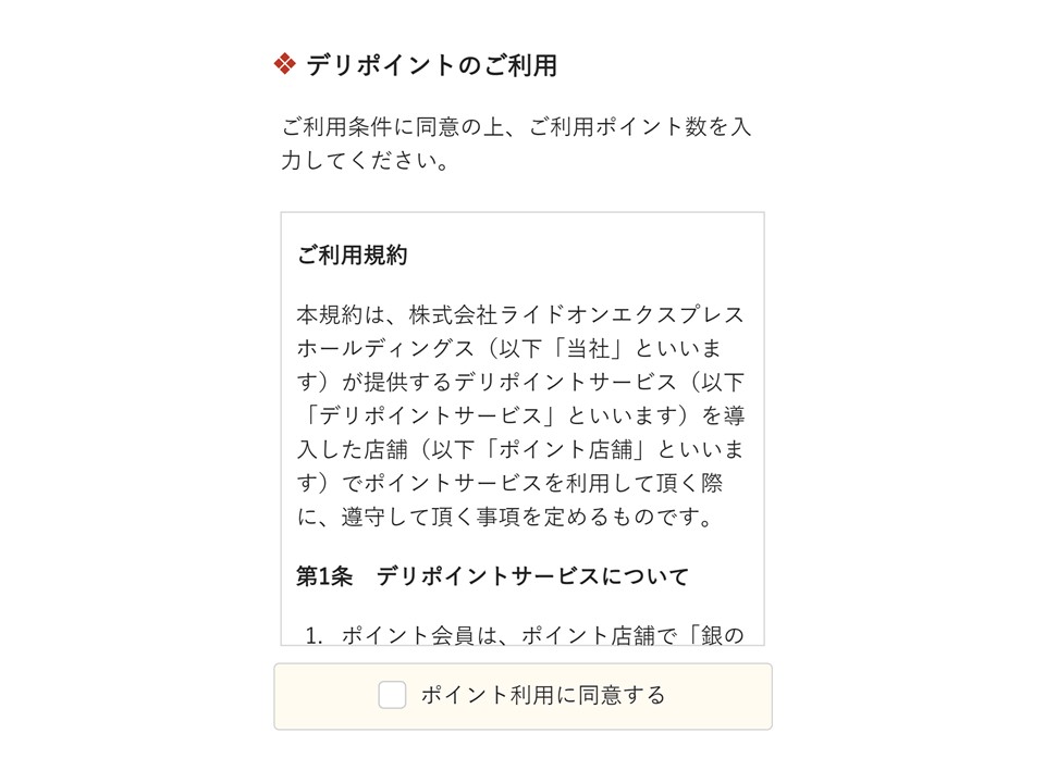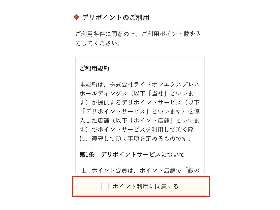 (1)規約をご確認の上、「ポイント利用に同意する」にチェックを入れてください。