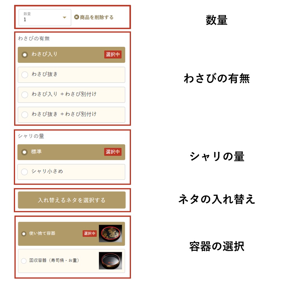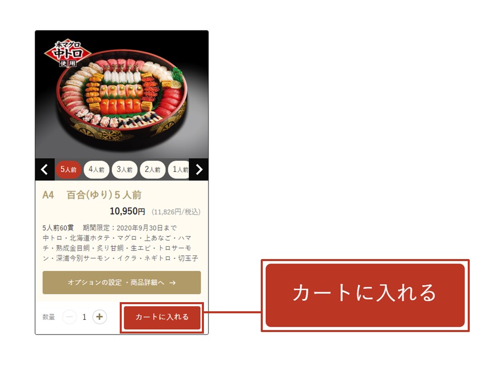 お好みの商品を選び、「カートに入れる」ボタンを押してください。「オプションの設定・商品詳細へ」ボタンから数量やオプションを設定してカートに入れることも可能です。