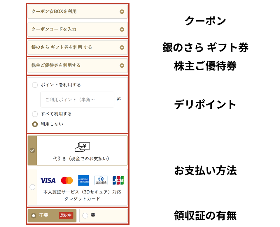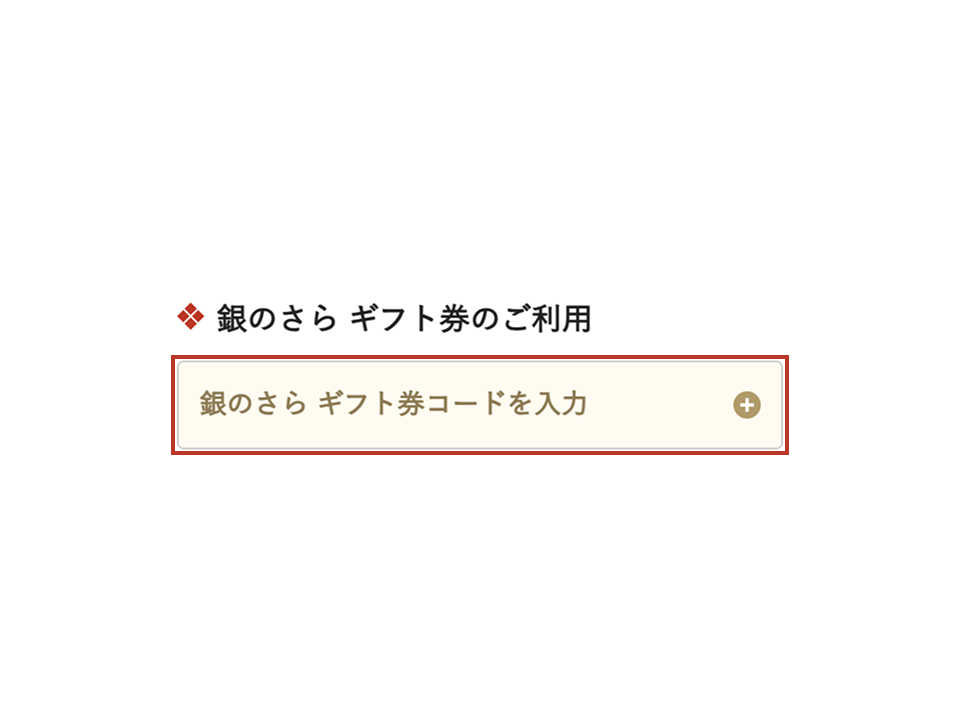 銀のさらギフト券は、お支払い方法の指定(注文情報を入力する)の入力時にご利用いただけます。「銀のさらギフト券コードを入力」ボタンを押してください。