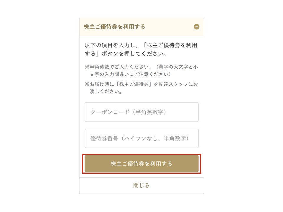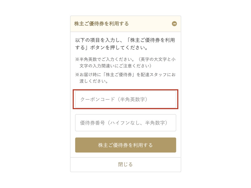 (1)お持ちの株主ご優待券のクーポンコード(半角英数字)を入力してください。